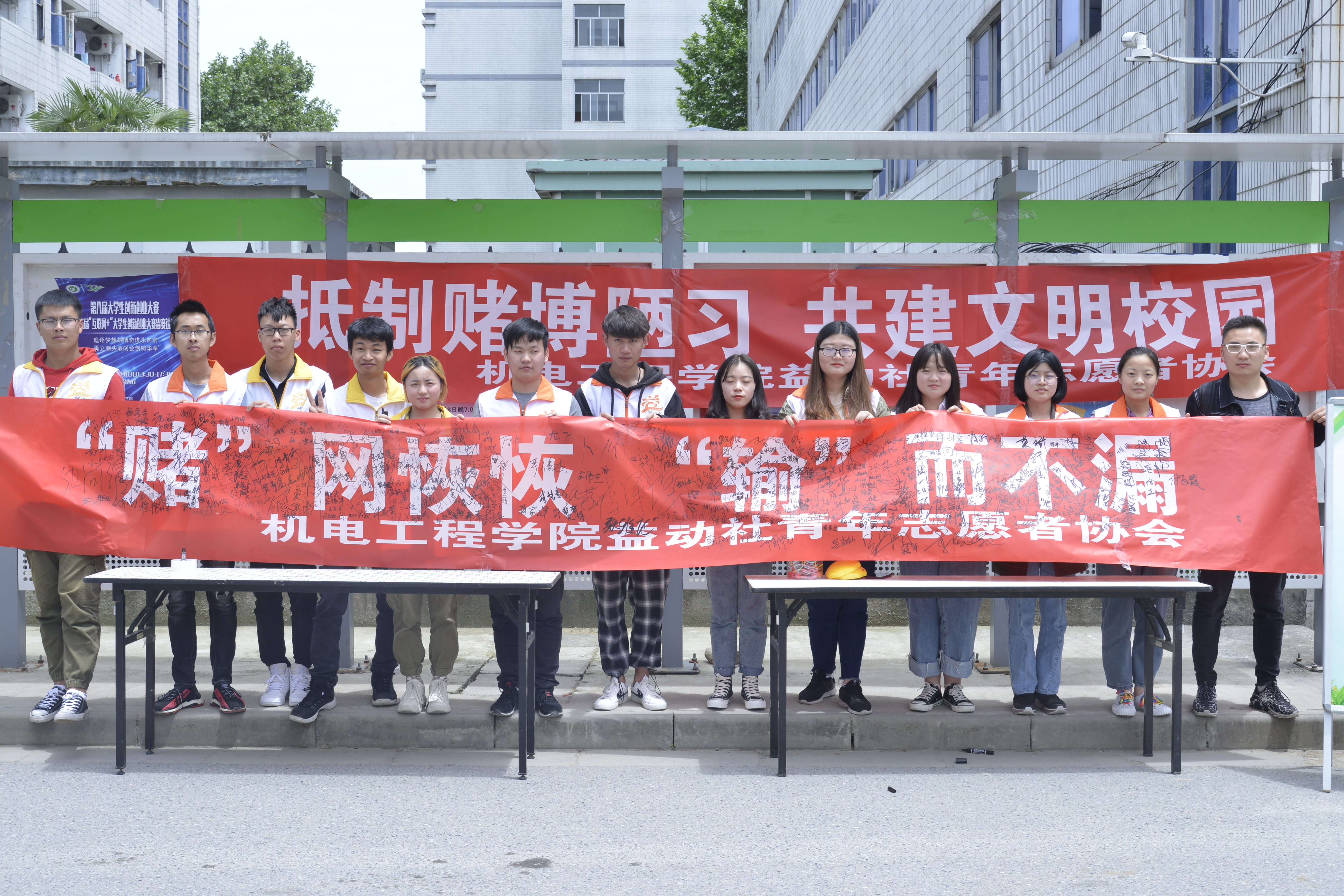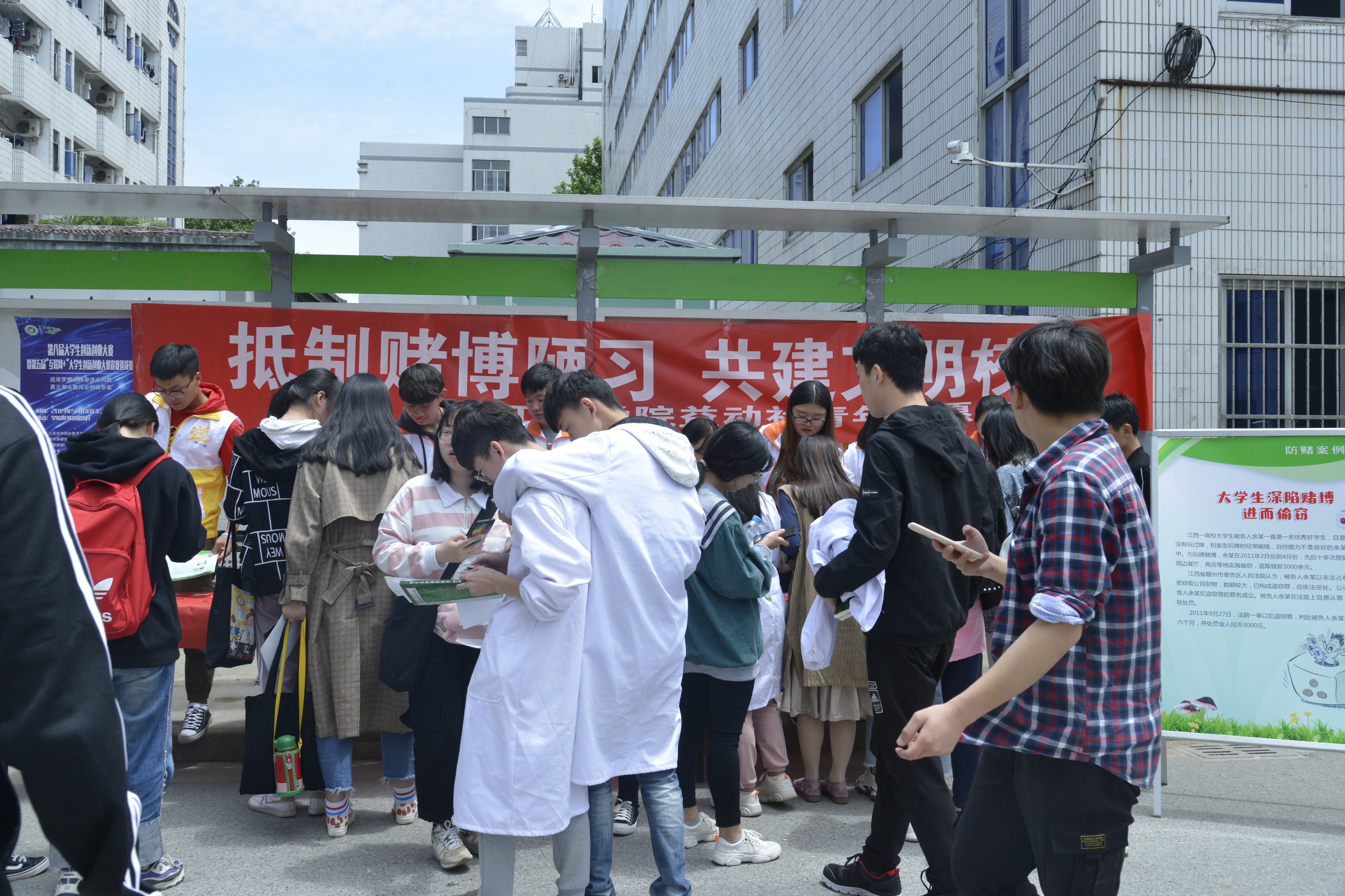 为了提高大家的警惕意识,认清赌博危害,抵制赌博行为,共同构建平安、文明、法治校园,2019年5月8日,机电工程学院在食堂广场举办“拒绝赌博陋习,共建文明校园”宣传活动。