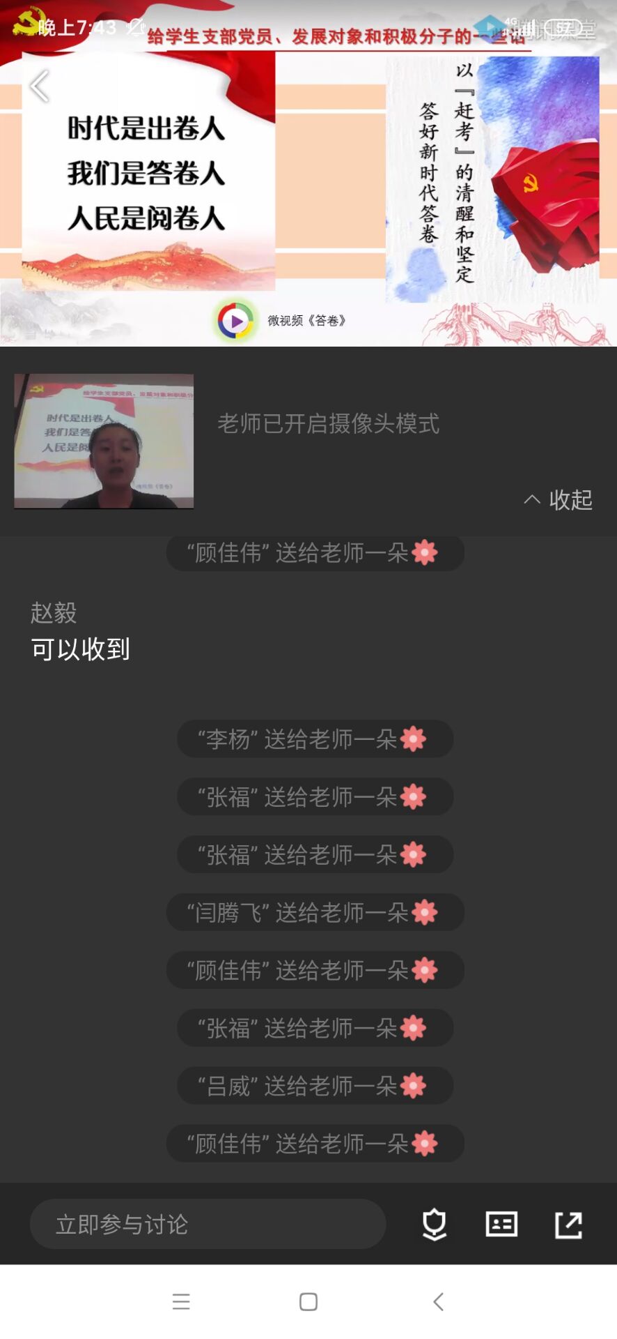 6月15日晚,机电工程学院党总支学生党支部代理书记祁曼同志,为全体支部党员、学生积极分子上了题为《中国共产党自我革命,永葆生机》的党课。党课在腾讯课堂直播和线下面授两个会场同步进行,保证了教育、学习、交流过程的全面覆盖。
