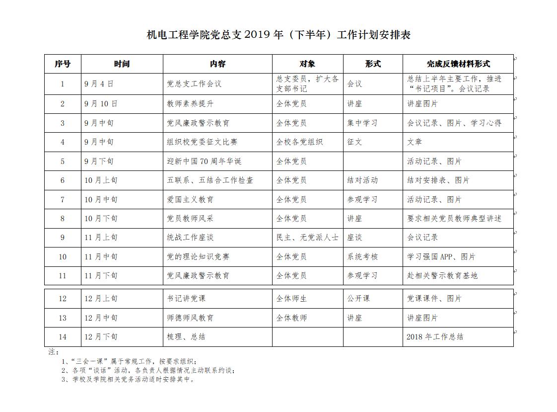 加强党的全面领导||机电工程学院党总支2019年(下半年)工作计划安排表