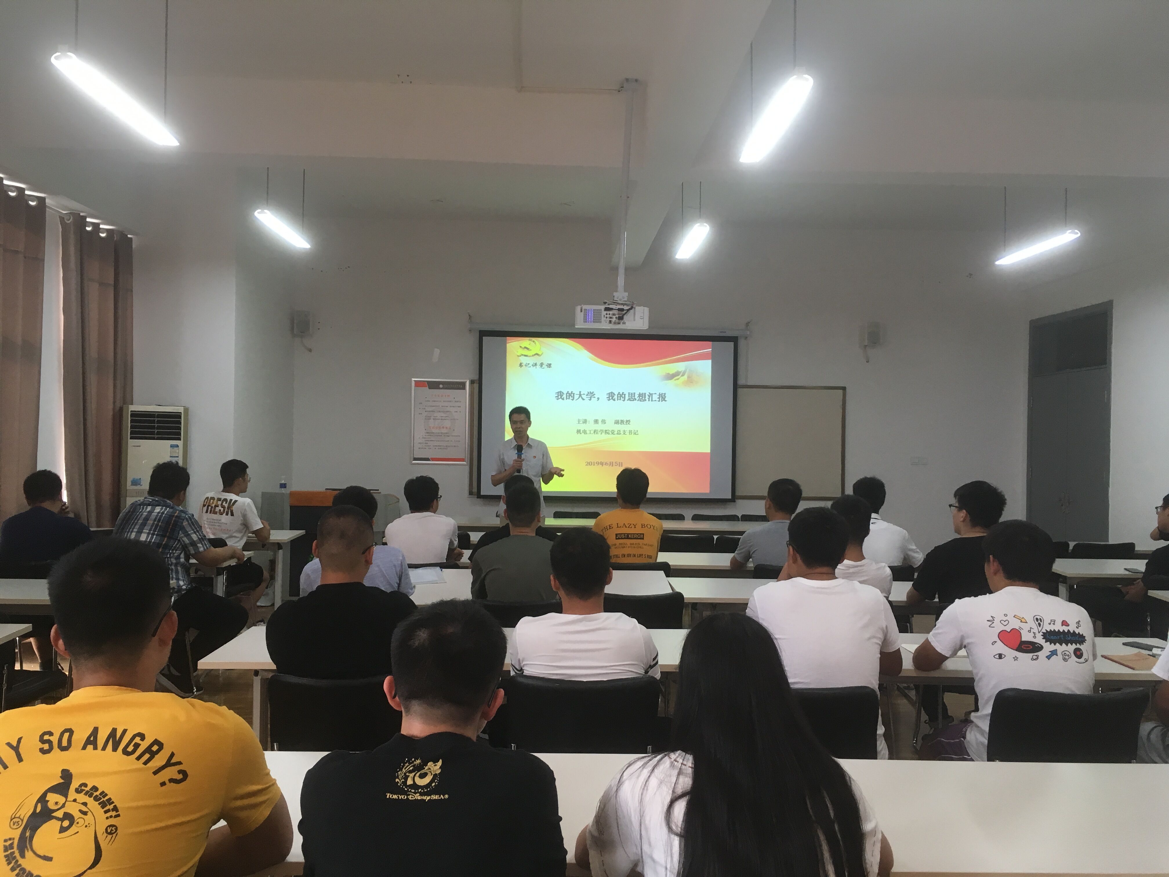 6月5日,机电工程学院党总支书记熊伟同志为学生代表做以“我的大学,我的思想汇报”为题的党课教育。