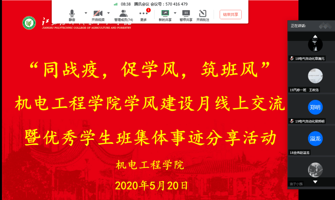 为增强班级凝聚力,畅通学习交流和反馈渠道,加强特殊时期的学风班风建设,5月20日晚,机电工程学院各班主要学生干部、入党积极分子相约在线,共同听取了“同战疫,促学风,筑班风” 学风建设月线上交流暨优秀学生班集体事迹分享会。学院党总支副书记李杨参加了本次活动。