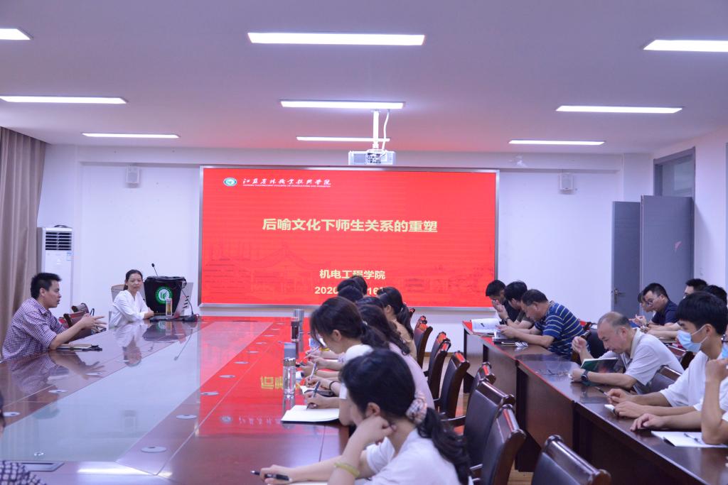 9月16日,机电工程学院2020年首期“师德师风大讲堂”在学院会议室举行。江苏省政协委员、学校首批师德标兵、马克思主义学院丁志春副教授应邀主讲,主题为“后喻文化下师生关系的重塑”。机电工程学院师生代表聆听了此次讲座。