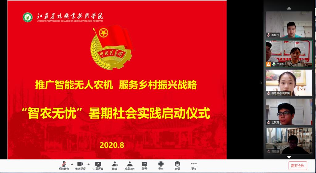 8月9日,机电工程学院团委“智农无忧”暑假社会实践启动仪式在工科楼A410小会议室举行。机电工程学院党总支书记熊伟、副书记李杨、农机教研室主任赵梦龙老师和暑期社会实践指导老师姜宽舒、祁曼和全体实践团同学通过腾讯会议参与此次启动仪式。
